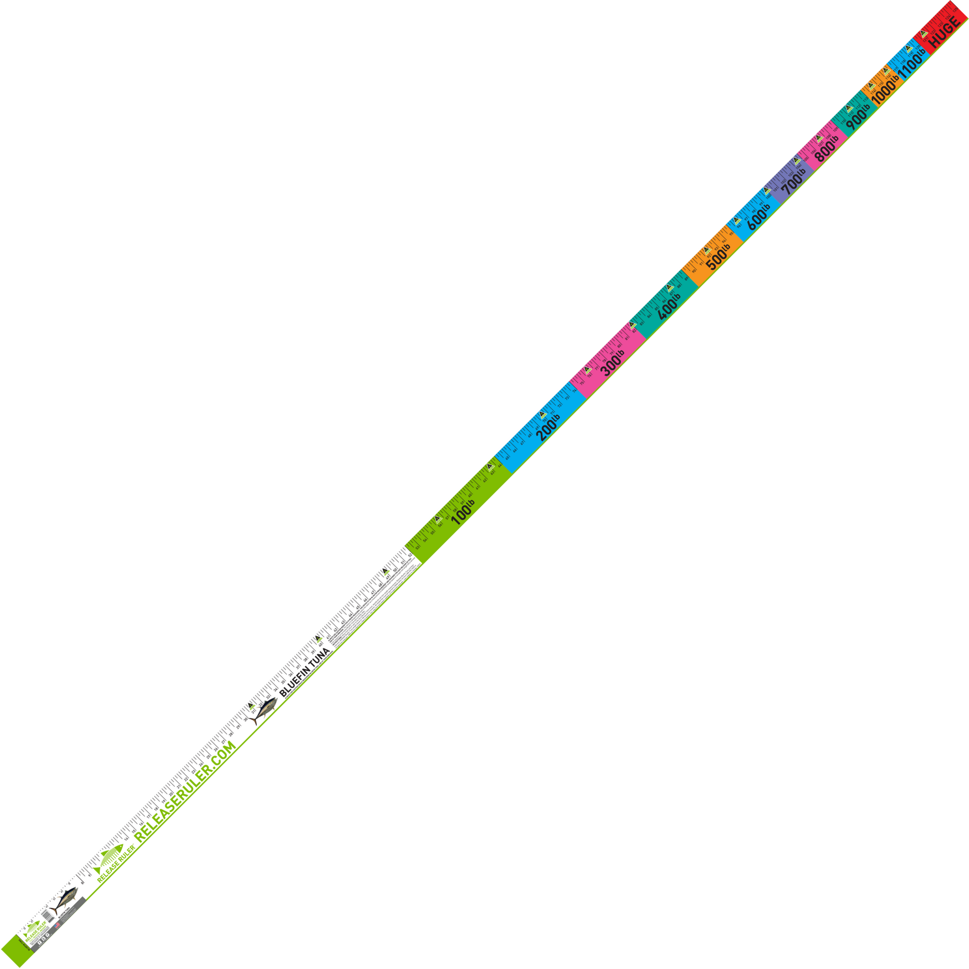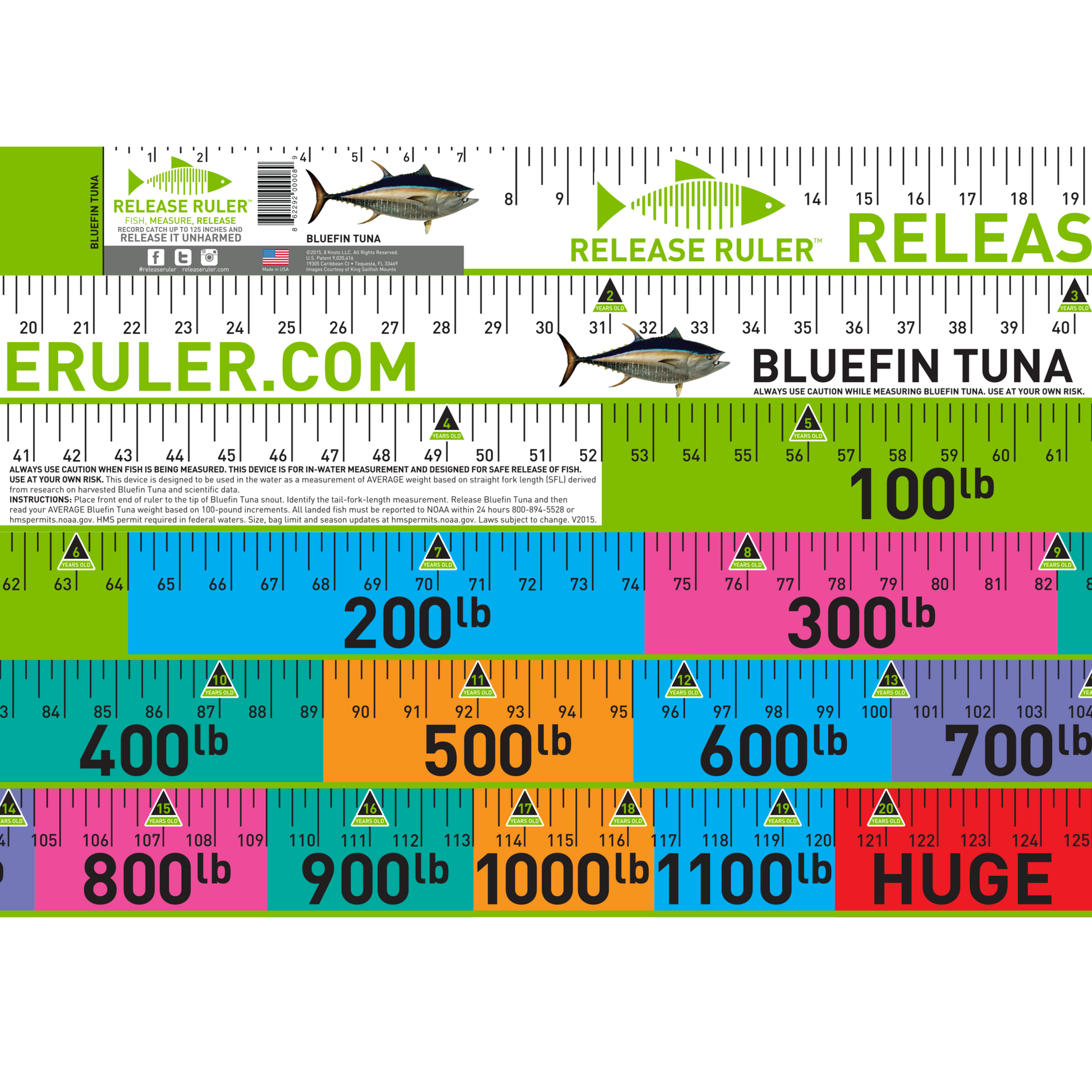 Stop Guessing weight! The Bluefin Tuna Release Ruler is the perfect tool to add to your fishing arsenal. Durable, tear resistant and easy to stow makes the Release Ruler perfect for the harsh saltwater environment. The contrasting colors are easy to read and provide the patented easy to read scale to estimate weight. Each ruler comes with the HUGE zone to designate grander size bluefin too.